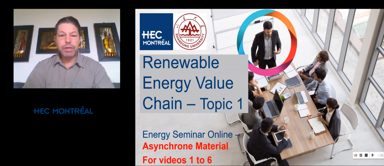 20级20名MBA学生通过zoom线上参加。来自蒙特利尔高等商学院的Sylvain Audette教授以“可再生能源价值链”为核心,在能源链的发展和趋势、全球能源问题以及中国的碳排放与交易系统等方面与同学们进行了线上分享和交流。