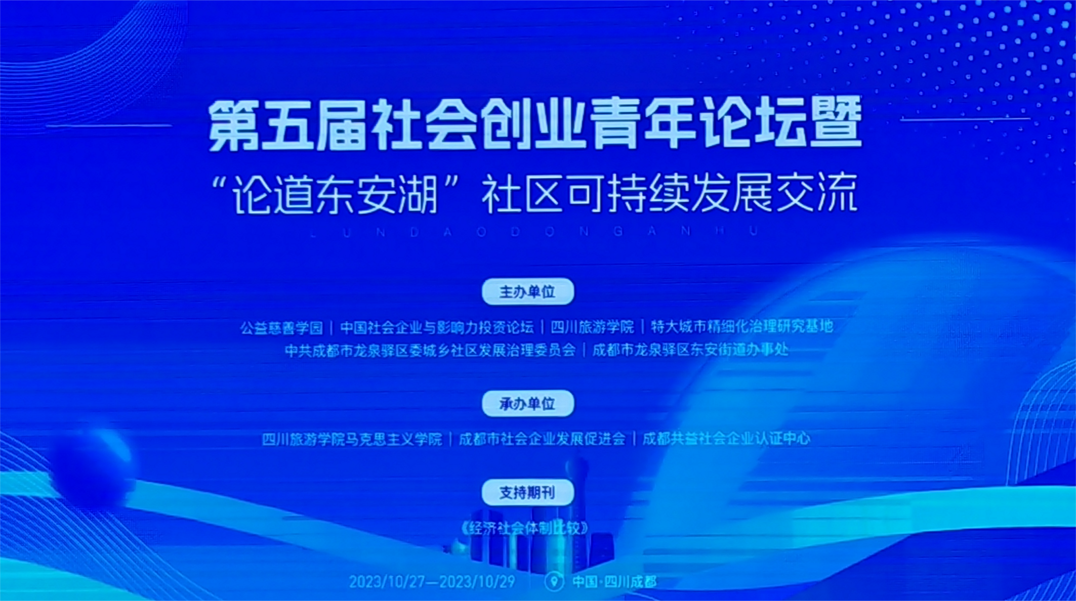 10月28日,由公益慈善学园、中国社会企业与影响力投资论坛、四川旅游学院等主办,四川旅游学院马克思主义学院、成都市社会企业发展促进会、成都共益社会企业认证中心承办的第五届社会创业青年论坛(2023)在四川旅游学院举行,论坛以“社会企业与社区可持续发展”为主题,旨在以社会企业为抓手,建立健全基层治理体制机制,提升城乡社区发展治理效能和可持续发展能力,创造幸福美好社区。来自中央编译出版社、《经济社会体制比较》杂志、国家发改委市场与价格研究所、北京大学、南京大学、四川大学、逼喱逼喱