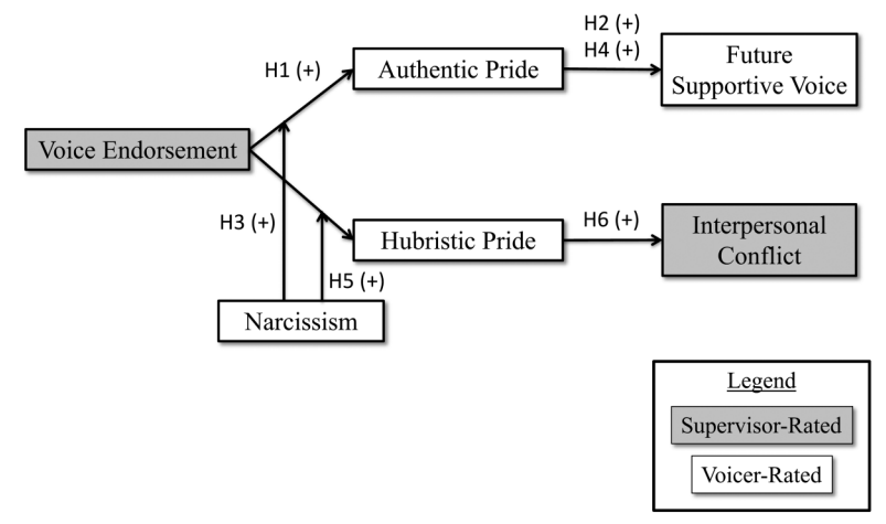 因此,为探明建言者对领导建言采纳后的不同反应,夏宇寰副研究员与合作者中佛罗里达大学Alex副教授等人,在研究“Strengthening Supervisor Bonds but ImpairingCoworker Relations? The Divergent Effects of Voice Endorsement”中,基于情感评价理论和自豪的两维结构(真实自豪感与傲慢自豪感),构建并验证了一个理论模型(如下图所示),来探究领导对员工的建言采纳产生的两种不同影响路径:关系维护路径和关系损害路径。研究数据来自一家高科技公司,包括414名建言下属和他们的112名领导。研究结果表明,就关系维护路径而言,建言采纳与建言者的真实自豪感(H1)呈正相关,激发建言者未来向领导提供的支持性建言(H2)。与此同时,关系损害路径表明了对于自恋程度较高的建言者,建言采纳与他们的傲慢自豪感(H5)呈正相关,导致他们与同事之间发生更多的人际冲突(H6)。本研究结果不仅有助于更全面地理解建言采纳对建言者自身及其人际关系的影响,而且对纳谏者和建言者如何对待建言采纳均具有一定的指导意义。