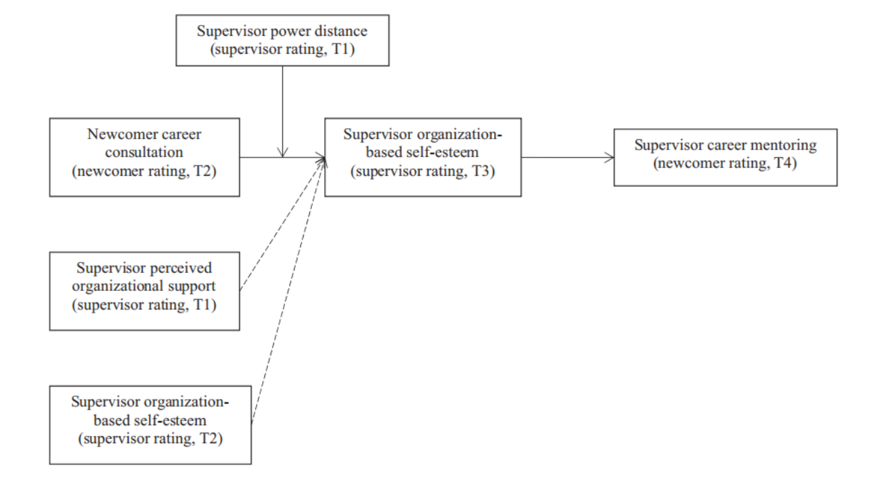 为此,夏宇寰副研究员与与合作者皇家墨尔本理工大学Ying Wang副教授等人,在研究“Why and when newcomer career consultation behaviour attracts career mentoring from supervisors: A sociometer explanation of supervisors’ perspective”中,基于社会测量理论构建了一个有调节的中介模型(如下图所示),并开展了一项涉及238名新员工-主管配对的滞后四阶段数据收集研究来探索新员工的职业咨询行为为何以及何时会引发主管的心理反应,从而激励他们对新员工进行职业指导。研究结果表明,新员工的职业咨询行为可以增强主管的组织自尊,从而增加他们为新员工提供的职业指导(H1);对于权力距离取向越高的主管来说,新员工的职业咨询行为对他们的组织自尊影响越显著(H2);新员工职业咨询与主管职业指导之间的间接关系,在主管组织自尊的中介作用下,受主管权力距离取向的调节。当管理者权力距离取向越高时,这种间接效应越强(H3)。这项研究不仅很好的补充了新员工社会化文献中组织内部人员的研究视角,也对于组织中管理者和新员工本人分别会如何看待和实施职业咨询行为提供了重要的实践指导。