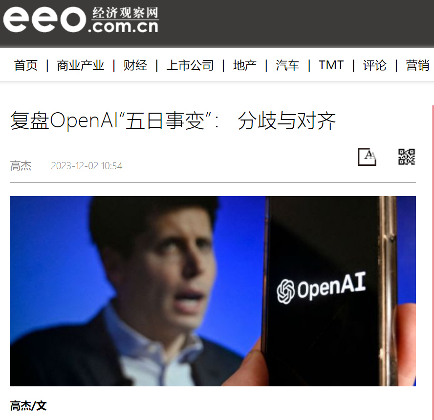 副研究员高杰在《经济观察报》第19版“数字化与人工智能”板块刊发署名文章《复盘OpenAI“五日事变”:分歧与对齐》,主要就世界顶级人工智能超新星公司OpenAI的管理层动荡事件展开复盘,探讨人工智能技术快速发展背景下的公司治理架构、创新转化与理念融合问题。