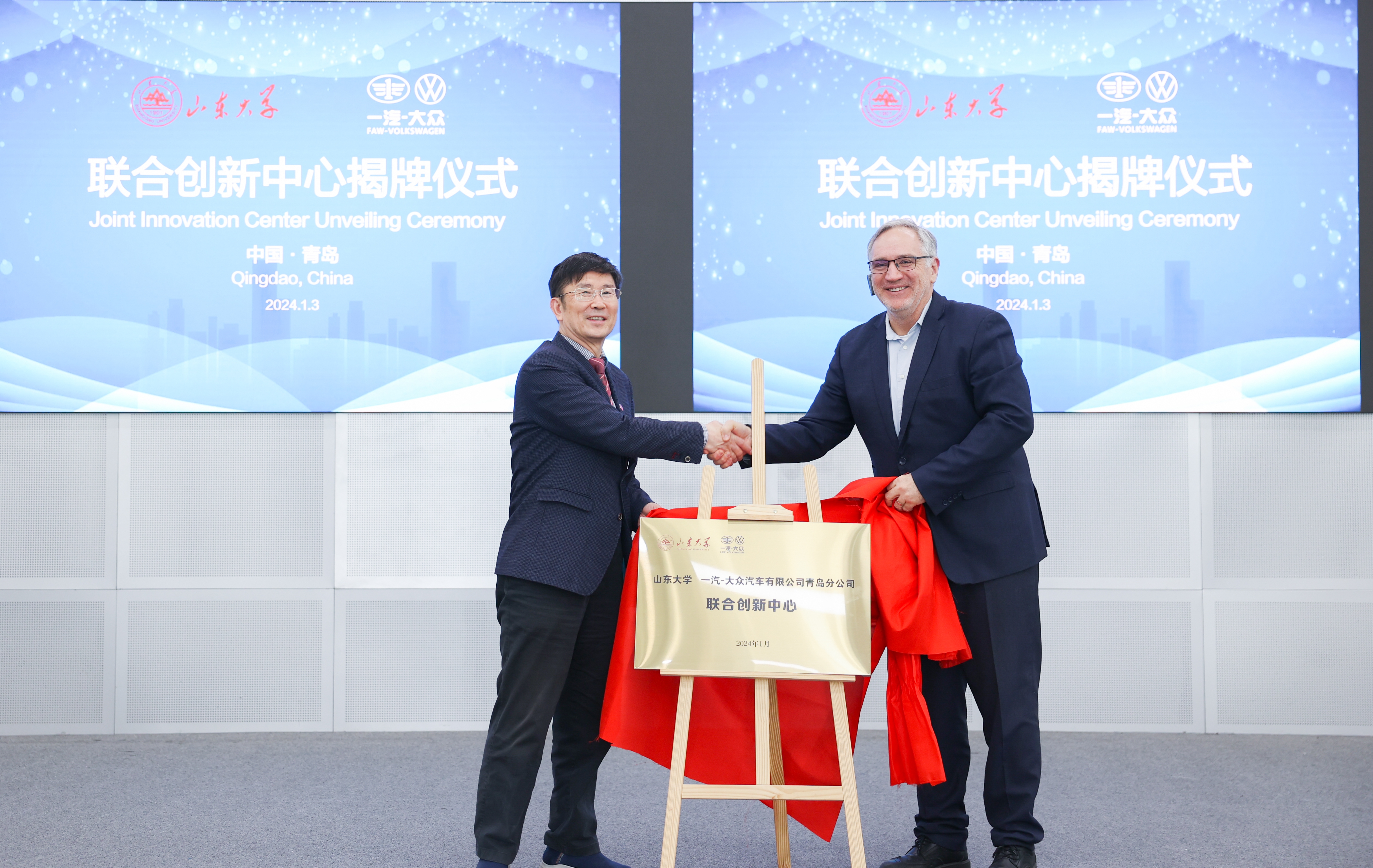 副院长乔岳、一汽-大众青岛分公司经理刘本发代表双方签署合作协议,韩圣浩、Bruno Torres共同为“联合创新中心”揭牌。根据协议,双方将围绕科研创新、人才培养、智库建设、数字化转型等方面开展全方位、深层次、常态化合作,力争打造汽车产业科技创新领域科学研究的新高地。