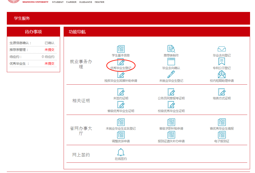 就业管理服务系统”后,进入“就业事务”-“优秀毕业生登记”,查看并完善登记表相关息,填写无误后提交至学院审核。
