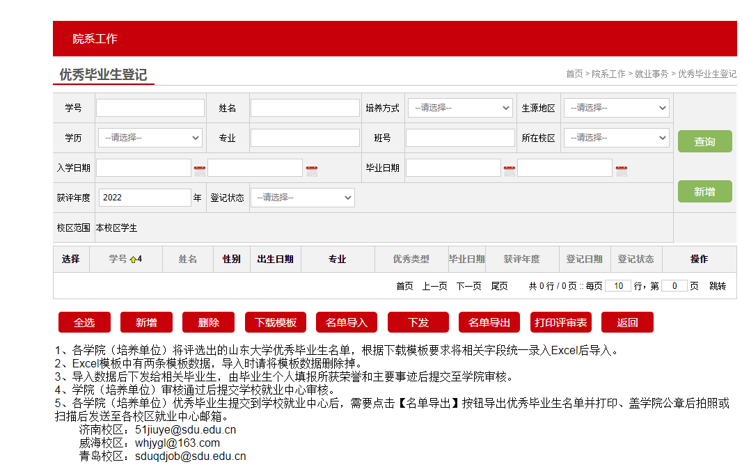 优秀毕业生汇总名单、学生在校期间成绩单及学院公示情况扫描后打包发送至相关邮箱(济南校区:[email protected],威海校区:[email protected],青岛校区:[email protected])。