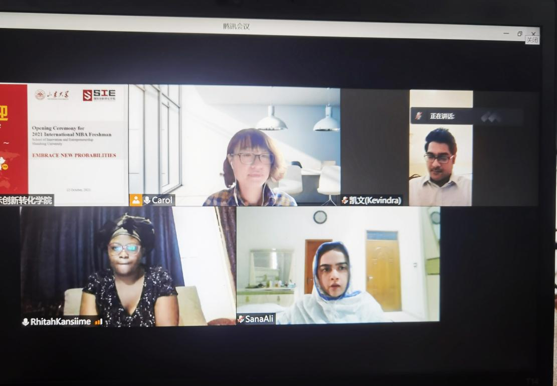 ,他介绍了学院的基本情况,以及国际MBA项目的培养理念。他提到,国际MBA是针对外国籍学生开设的高级管理学课程,采取全英文授课的形式,旨在培养掌握现代管理理论、管理技能和管理技术,能够独立从事企业管理实践工作的职业经理人。项目通过采取模块化方式,暨基础模块、核心课程模块、选修课模块、实践模块的教学方式,突出学生的参与和教师与学生、学生之间的相互交流和沟通,共享师生已有的管理实践和经验。他希望学生们通过课程、讲座,以及未来疫情结束后的实地考察等多样化形式,接触和了解真正的中国、山东和青岛、济南,并在交换彼此观点的过程中增长学识、增进友情。