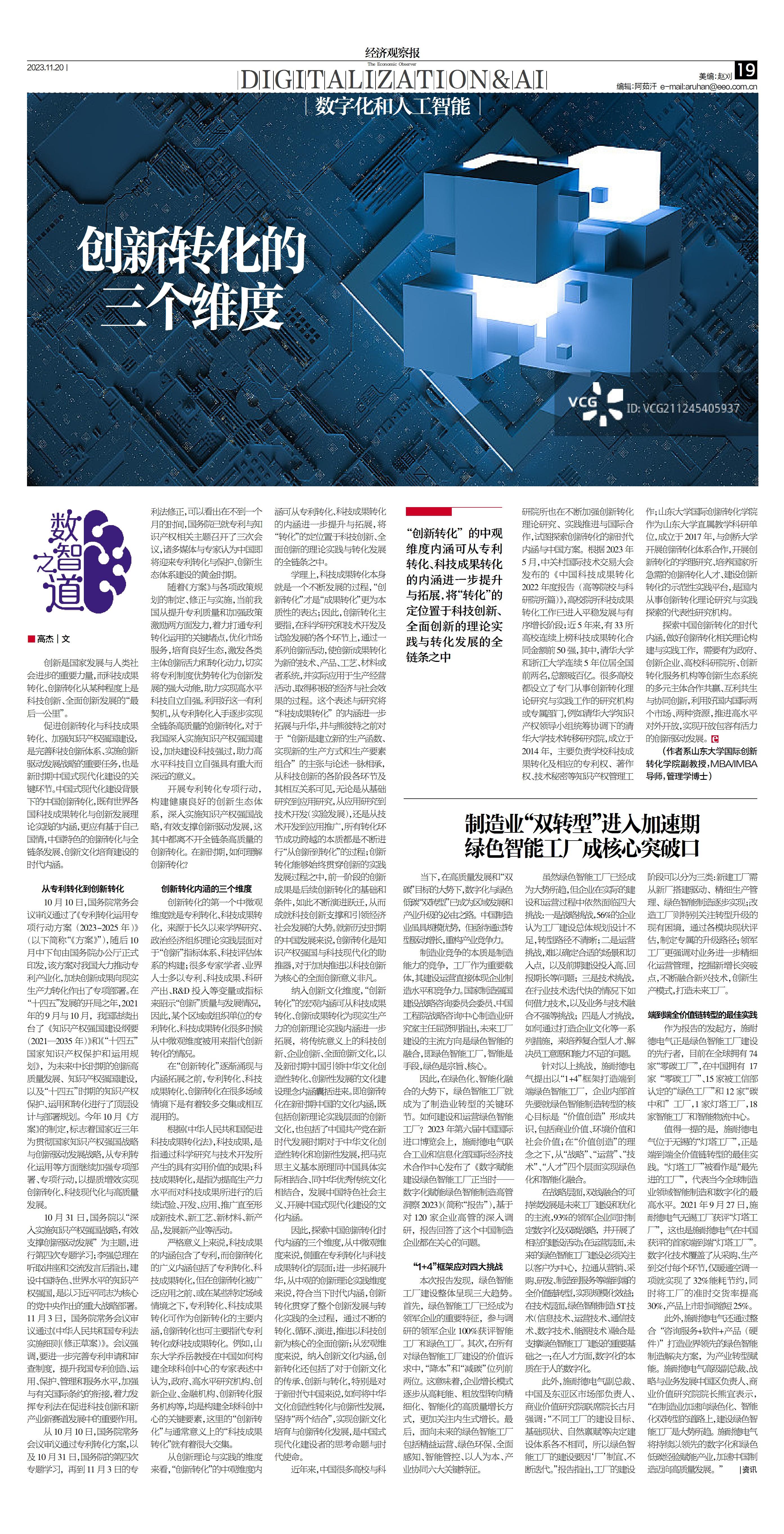 副研究员高杰在《经济观察报》“数字化与人工智能”板块刊发署名文章《创新转化的三个维度》,主要基于学院老师的创新转化理论研究与创新实践,探讨了中国式现代化建设背景下的,中国创新转化的时代内涵与理论维度。