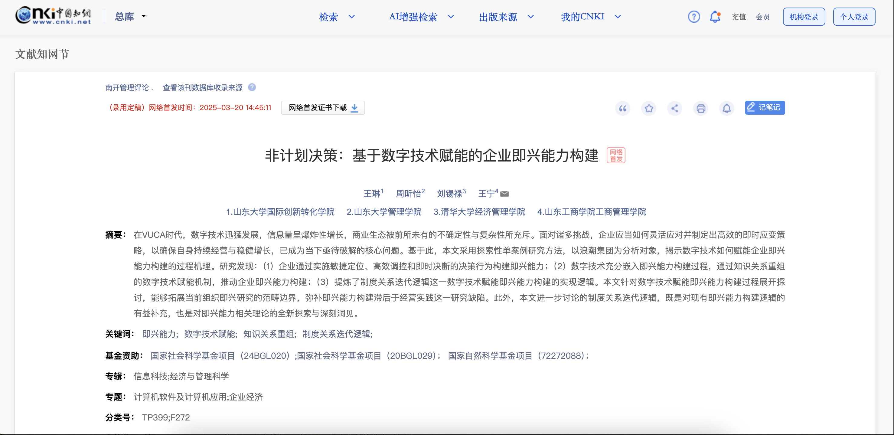 副教授王琳、管理学院硕士研究生周昕怡、清华大学经济管理学院博士后刘锡禄以及山东工商学院工商管理学院副教授王宁在《南开管理评论》期刊(2024年复合影响因子为13.929,期刊综合影响因子为7.263)发表题为《非计划决策:基于数字技术赋能的企业即兴能力构建》的研究论文。王琳副教授为该论文的第一作者,逼喱逼喱