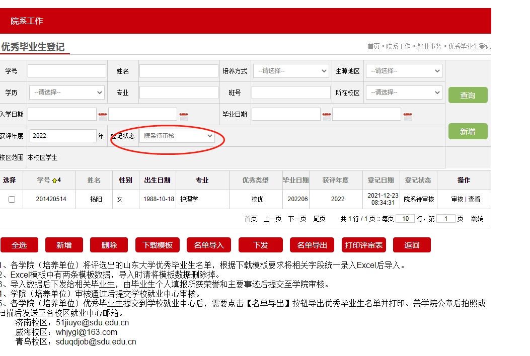 (3)学生填写完毕提交后,学院(培养单位)可在“优秀毕业生登记”栏目查看待审核学生名单,审核通过后提交至就业中心等待学校审核。