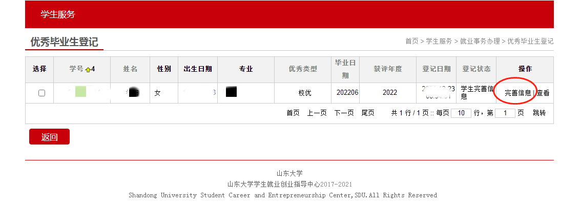 就业管理服务系统”后,进入“就业事务”-“优秀毕业生登记”,查看并完善登记表相关息,填写无误后提交至学院审核。